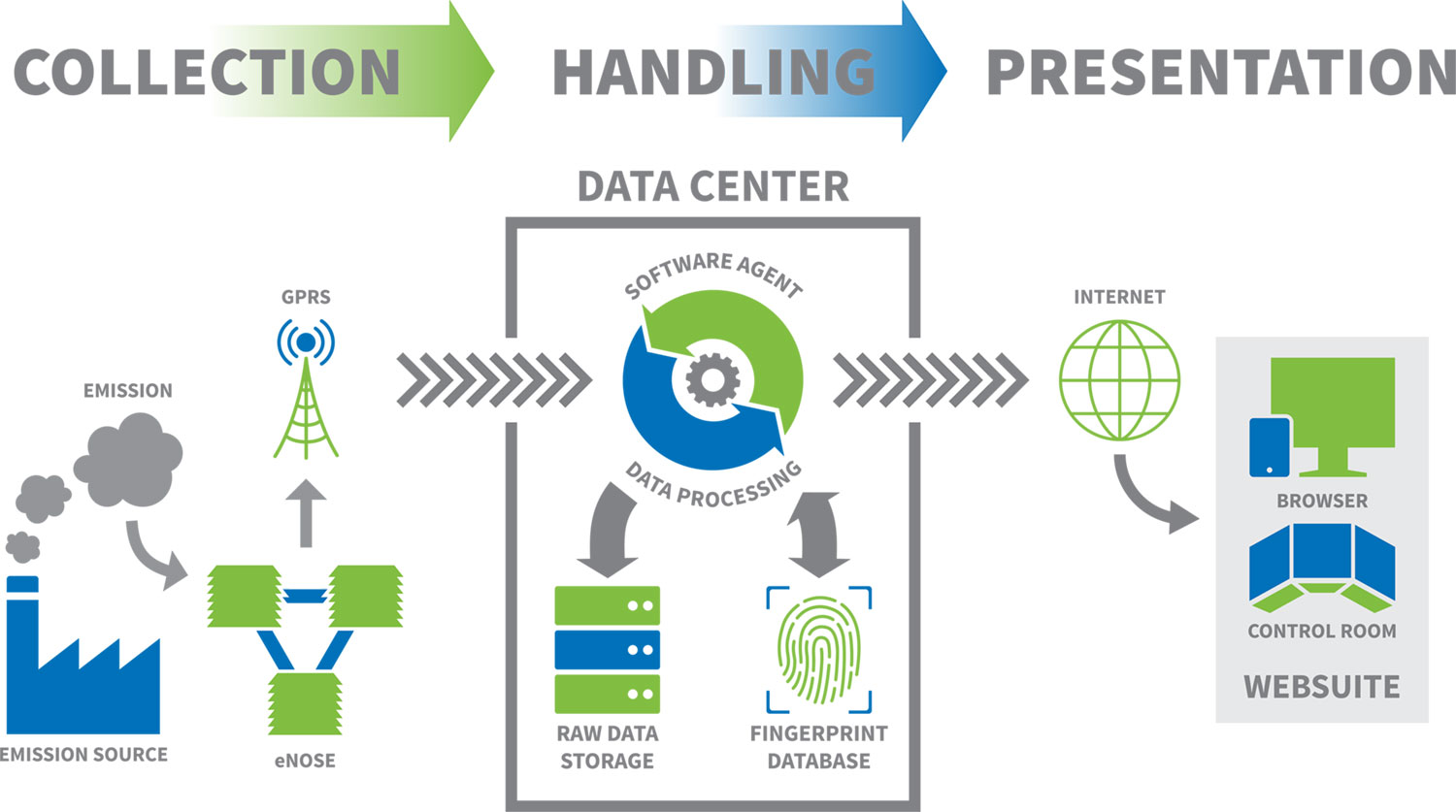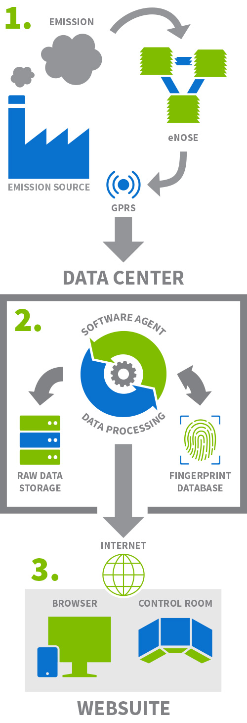 eNoses in the field are remotely connected to a server in a data center via a wireless GPRS link. The raw eNose data are 24/7 transmitted to the remote server periodically. The logging frequency is adjustable.