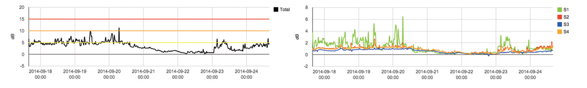 Via the Websuite clients have access to all their eNose data, which is accessible 24/7. Besides the representation on a GIS map, eNose data can be graphically displayed. Each eNose can be analysed separately and anomalous peaks in the eNose registrations of the air composition can be identified.